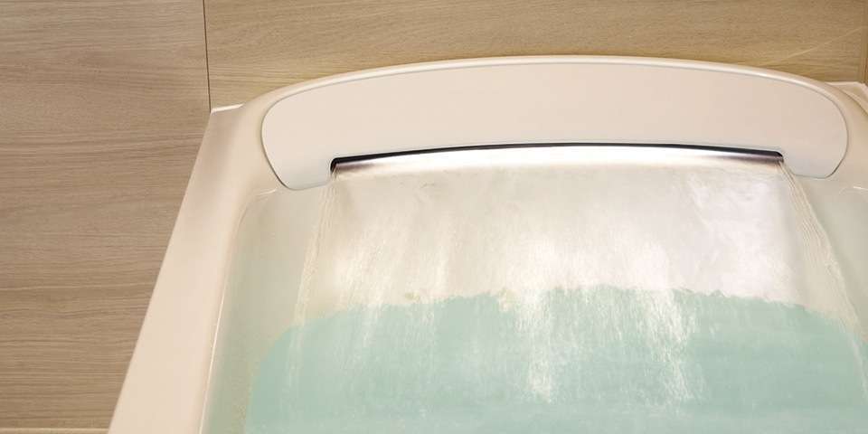 TOTOの肩楽湯と腰楽湯は浴槽のカタチに特徴があります。通称・ファーストクラス浴槽という浴槽の形状でTOTOが人間工学にもとづいて設計したプロダクトです。身体にかかる負担を分散させるような形状に仕上がっています。